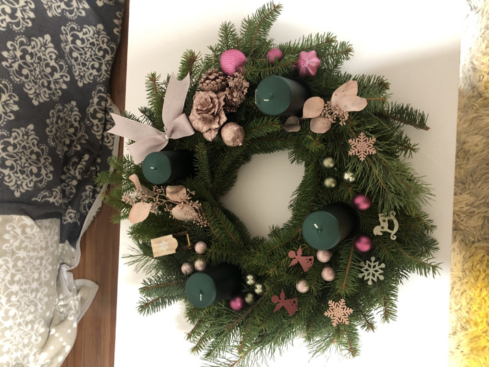 Adventní venec se svickama na stul ručně vázány z živých smrkových větviček a dekorovani tavnou pistoli moc těžkými umělými dekoracemi
