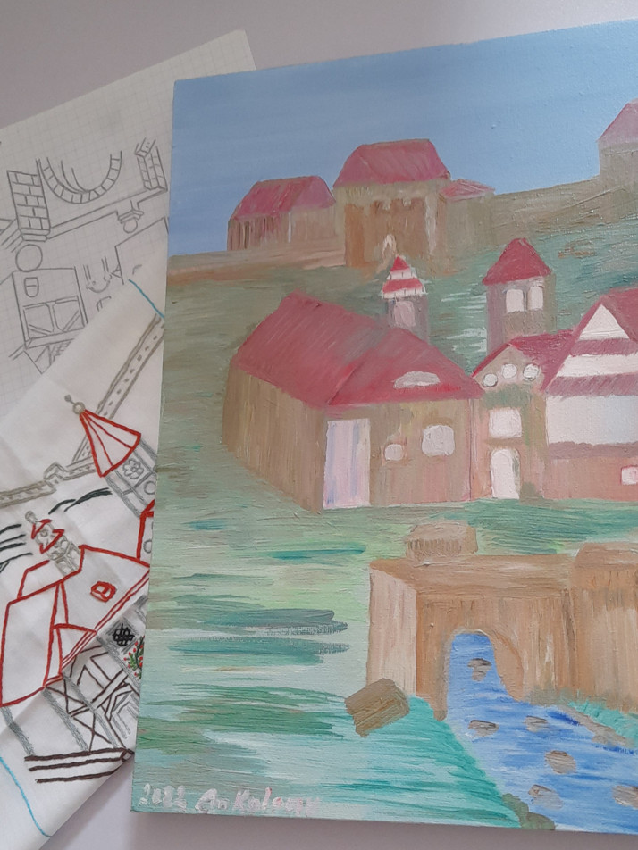 Kresba tužkou, výšivka a olej/plátno malované