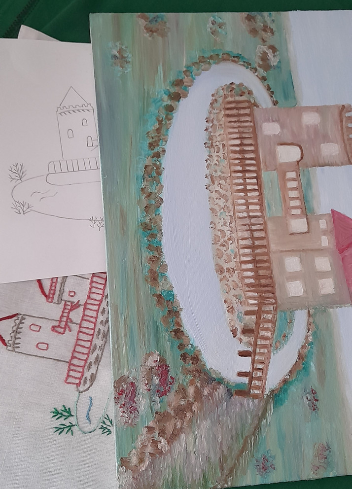 Středověká pevnost k bydlení za vysokou hradbou s vodním příkopem