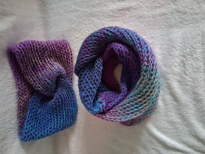 Ručně pletený set čelenky a nákrčníku s duhovými přechody. Měkký, hřejivý, pružný a nekoušavý originál z vlastní tvorby.