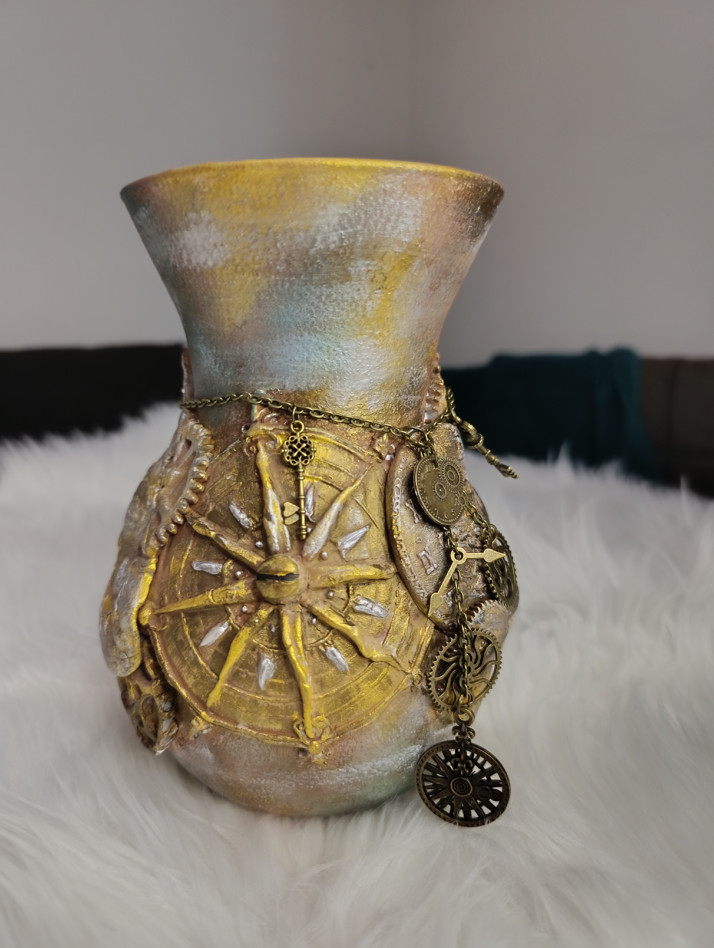 Skleněná váza zdobená samotvrdnouci hmotou, kovové prvky, akryl