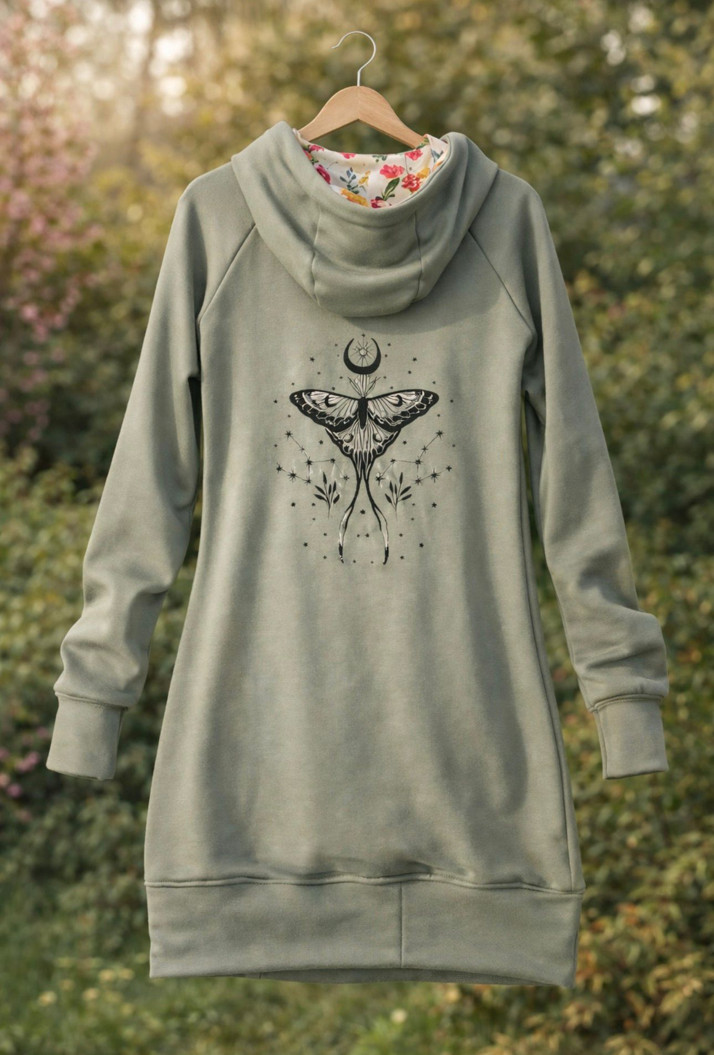 Jemné, pohodlné a přesto výrazné. Mikinošaty v tlumeném olivovém odstínu zdobí autorský motiv mystického motýla s měsíčním symbolem, který působí něžně a lehce magicky.