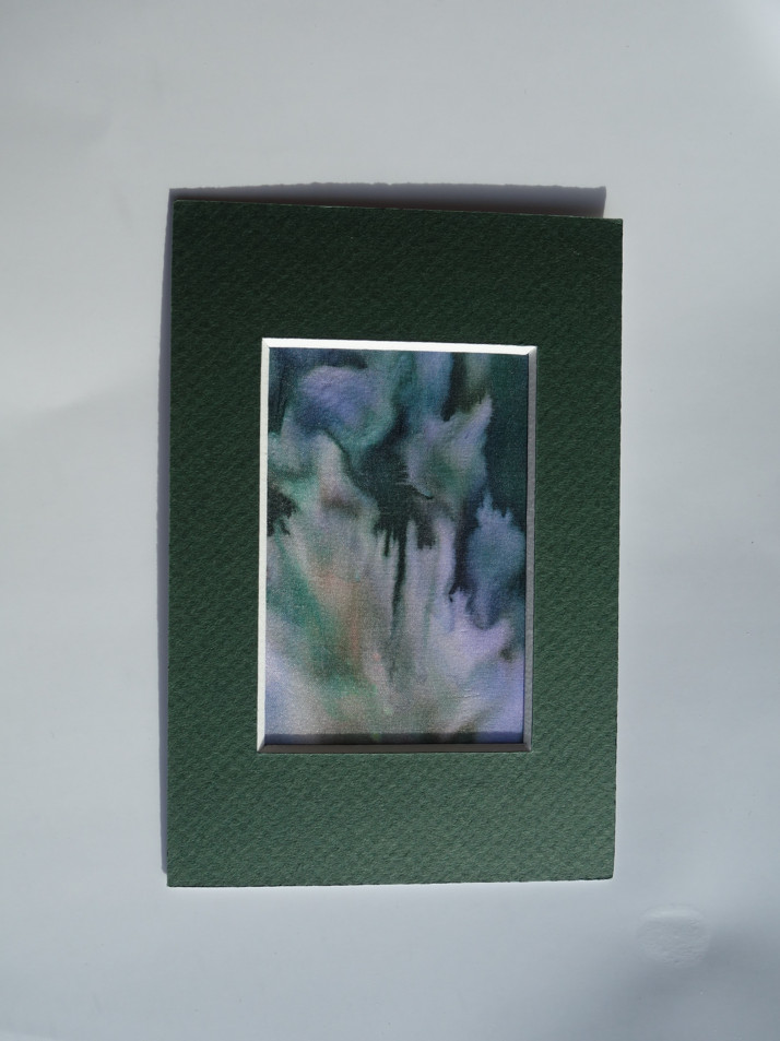 ruční malba na hedvábí, obrázek v paspartě, podlepené samolepící folií, rozměr 10x13cm