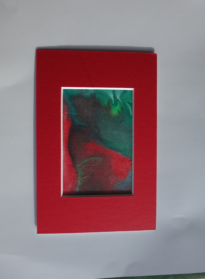ruční malba na hedvábí, obrázek v paspartě, podlepené samolepící folií, rozměr 10x13cm
