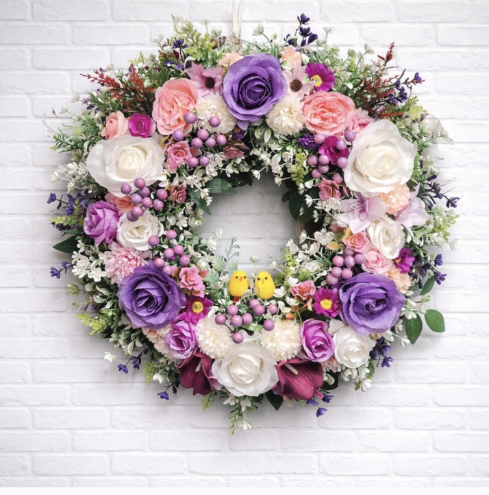Ručně vyráběný věnec z kvalitních umělých květin, který rozzáří každé dveře i interiér. Bohaté vrstvení květů, jemné pastelové barvy a malé detaily, které dělají věnec výjimečným