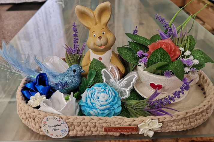 Háčkovaný košík s velikonoční dekoraci a mýdlovou květinou