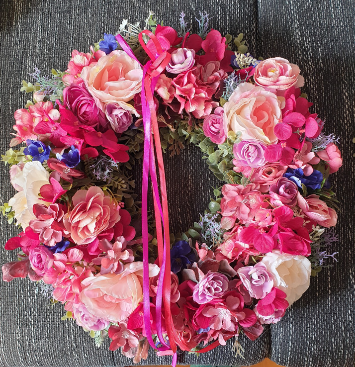 Jarní věnec na dveře z umělých kvetin. Rozměr věnce-47 cm.
