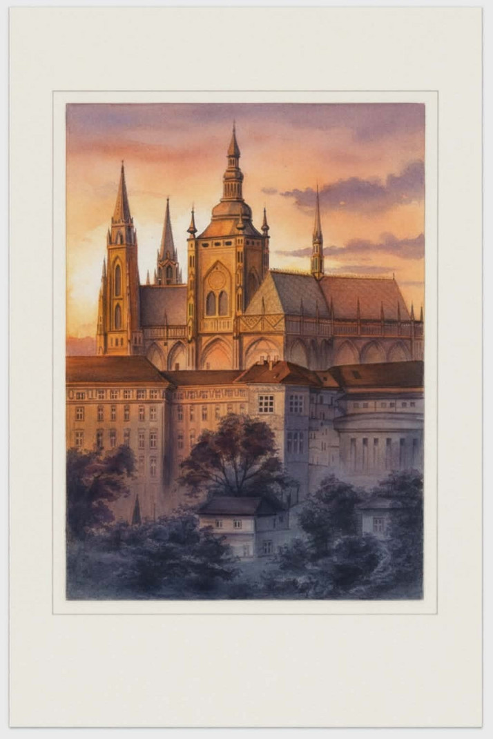 Tento autorský obraz zachycuje ikonickou siluetu katedrály sv. Víta v momentě, kdy se do jejích zdí opírají poslední paprsky zapadající slunce.