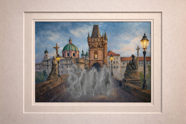 Tento obraz není jen pohledem na starou Prahu. Je to průhled do historie, kde se v ranním oparu na Karlově mostě zhmotňuje nečekané setkání...