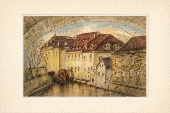 Tento obraz je vyznáním lásky k jednomu k nejkouzelnějších míst staré Prahy. Zachycuje tiché odpoledne u Velkopřevorského mlýna, kde se pod obloukem mostu zastavil čas.