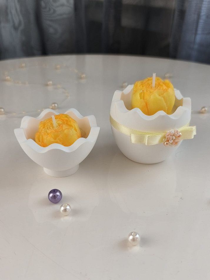 Luxusní svíčky ve tvaru květin v ručně vyrobené nádobě s jesmonitu ve formě vajíčka.