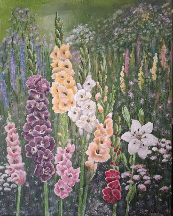 obraz, Gladioly - louka, akryl, plátno 30x40, darováno
