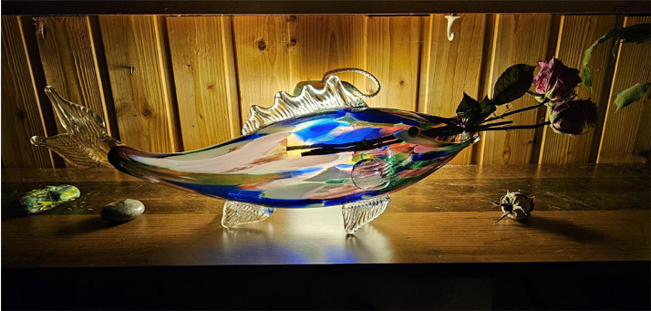 Nádherný sběratelský kus s rodinným příběhem a praktickým využitím.Velká, těžká skleněná váza z hutního skla v protáhlém tvaru ryby, který připomíná štiku. Ryba je dutá s otevřenou tlamou a slouží jako originální váza na jednu až dvě dlouhé růže nebo jiné květiny. Uvnitř těla se prolínají barevné pruhy v odstínech modré, růžové, zelené a bílé. Při prosvícení sklo nádherně září a barvy ožívají. Ploutve, hřbet a ocas jsou z čirého skla. Každý kus je originál, ruční práce sklářského mistra. Rozměr: 48 cm na délku, 7-8 cm na šířku. Pro představu velikosti přikládám foto s hrnkem vysokým 10 cm.Získala jsem ji darem od tety jako poděkování za opravu stolu. Teta ji měla doma už když jsem byla dítě, takže je prokazatelně starší než 50 let. Autor neznámý.