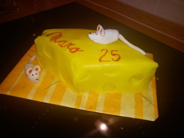 Piškotový dortík s krémem, potažený mléčným marcipánkem.