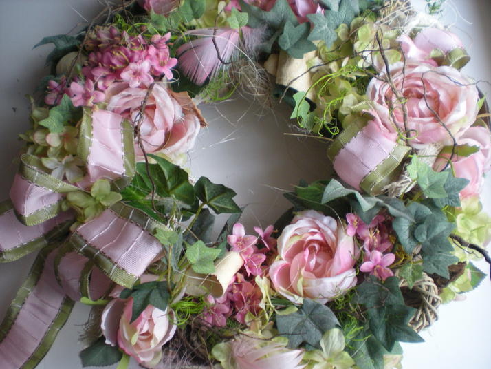 Romantický věnec s něžnou stuhou si snadno představíme v typicky anglickém domě, plném tepla a klidu.