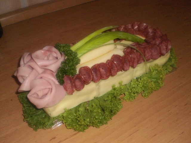 Hranatý, z toustového chleba, růžičky ze šunky, vysočiny, další ozdoba pórek a uzený sr..