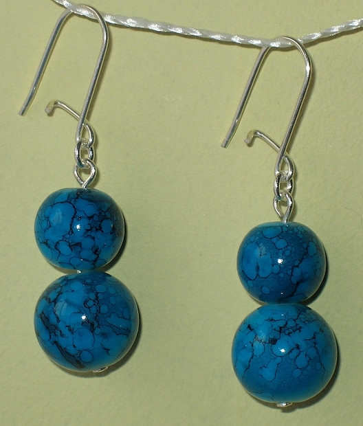 Ketlované náušnice - modré korálky s černým žilkováním, stříbrné ketlování (háčky, ketlovací nýty, kroužky)