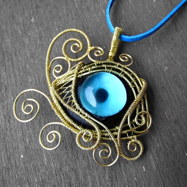 Velice složitý a krásný šperk v egyptském stylu jsem nazvala Raovo oko, dle slavného egyptského symbolu vševědoucího oka. Na výrobu bylo použito několik rozličných technik - drátování, wire wrapping, modelování polymerové hmoty a úprava skla. Šperk je vyroben ze sklenéného kabošonu upraveného tak, aby vyvolával efekt oka. Tento kabošon je následně zasazen do lůžka z polymerové hmoty Cernitu, která jako jediná neobsahuje ftaláty. Tato konstrukce je následně velice pečlivě obpletena různými tloušťkami mosazného drátu drátovací technikou wire wrapping. Šperk měří 5,5x5 cm a je zavěšen na modré kůžičce (tloušťka 2mm, délka cca 80cm), která výborně dotváří barvu šperku (Na žádost je možno zavěsit na jinou barvu kůžičky, např. žlutou, ...). Ekvivalent tohoto šperku se účastní červnové soutěže wire-wrappingového klubu