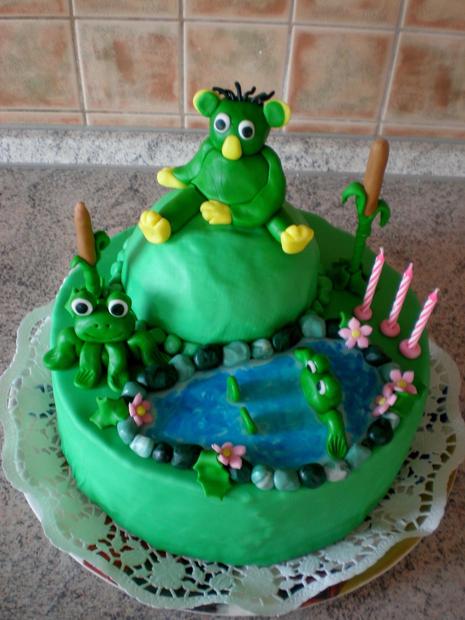 Kulatý dvousposchoďový dort.Korpus a krém podle přání zákazníka.Rákosníček a žabičky modelace z marcipánu.Váha 4,5 kg,cena 580 kč.