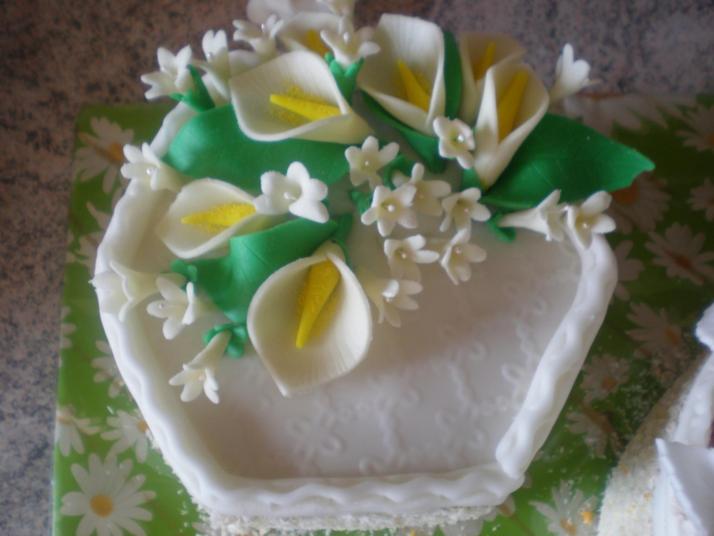 Šestihran potažený marcipánem,modelace kaly a bílá kvítka.Korpus,krém dle přání zákazníka.Lza udělat i jiné květy- dle přání.Cena 520 kč.