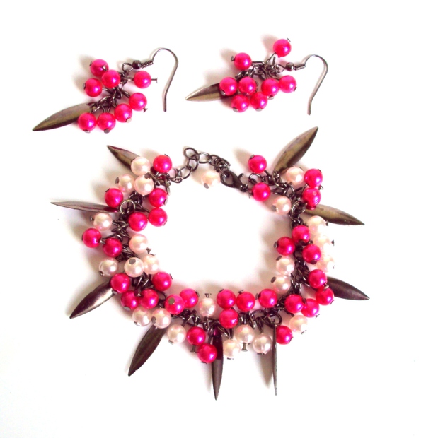 náramek a náušnice v krásné růžové, doplněno kovovými komponenty antracitové barvy