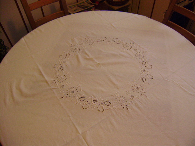 Kulatý ubrus 160x160,vyšitý vzor richeliou a lem.