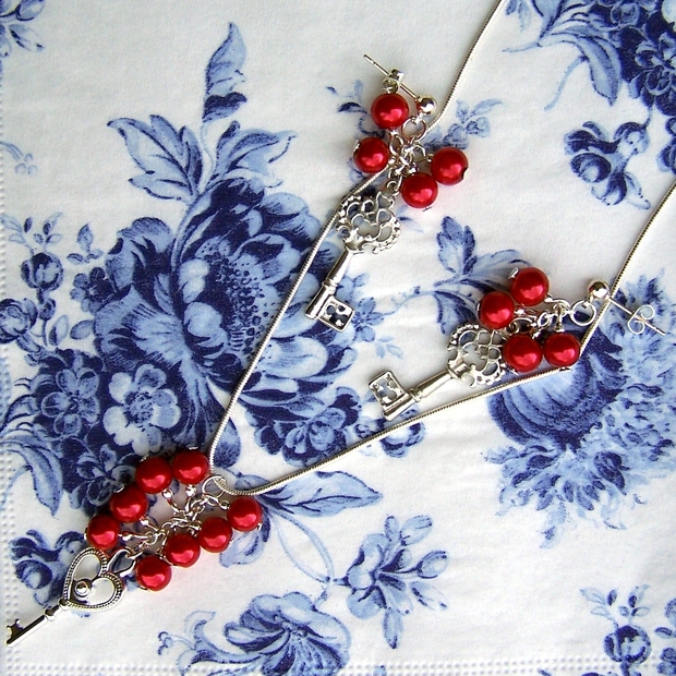 Vyrobeno z červených voskovaných perlí, strříbrného drátku a přívěšků klíčků v bravě strříbra a starostříbra.