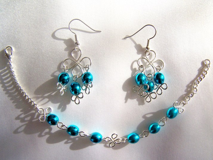 Vyrobeno z postříbřeného drátku a tyrkysových voskovaných perlí.