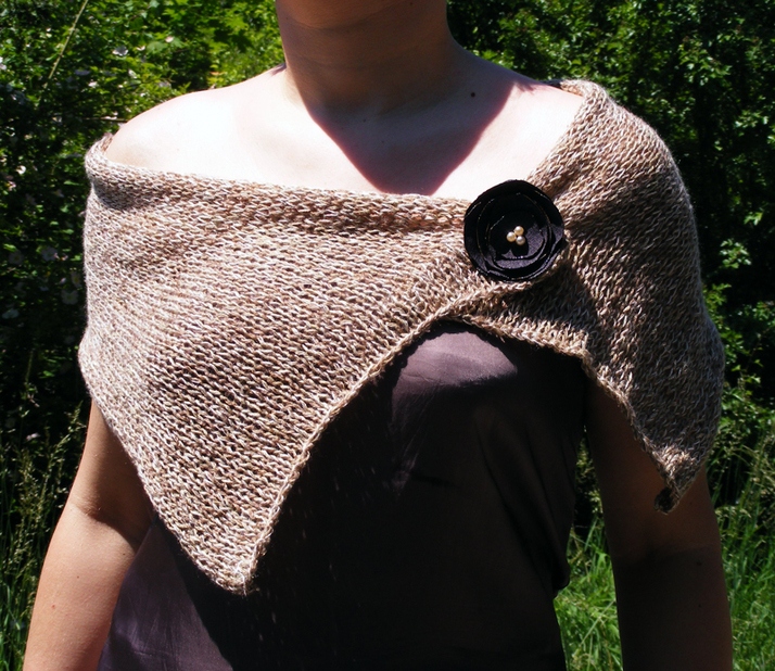 Ručně pletená šála zapínaná textilní broží ve stejném odstínu. Šála je pletená ze čtyřech různých přízí ve složení vlna, viskóza a bavlna.
