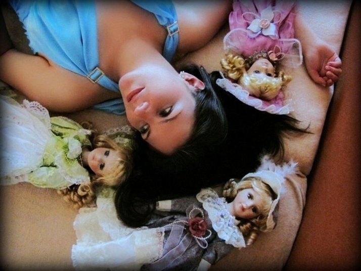 kamarádka pózuje v posteli se svými panenkami