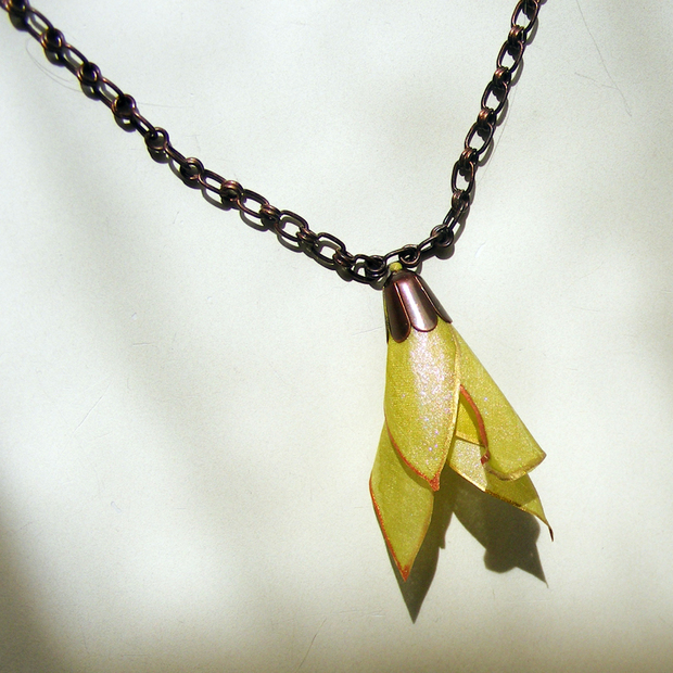 hedvábný náhrdelník je zhotoven z lístků přírodního hedvábí a měděných komponentů.