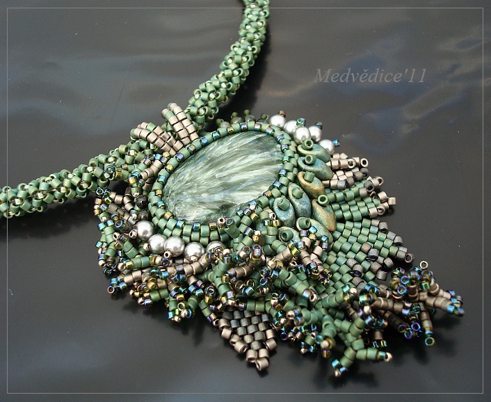 korálková výšivka a šití, serafinit, miyuki, toho, turmalín, voskované perličky