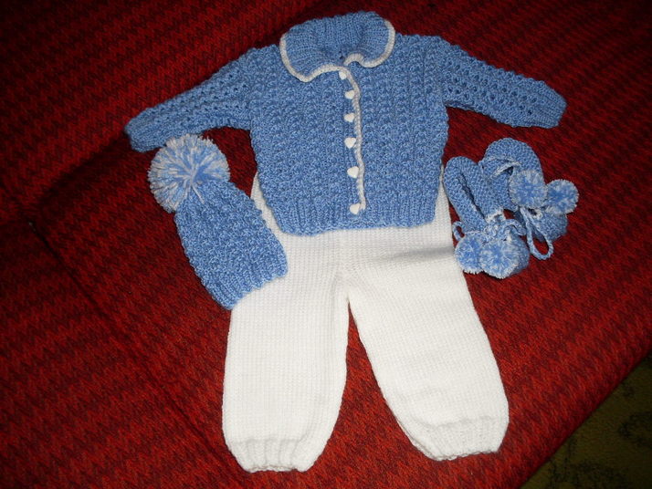 Pletený svetřík,čepička,bačkůrky a kalhoty pro mimča.Cena 600kč.