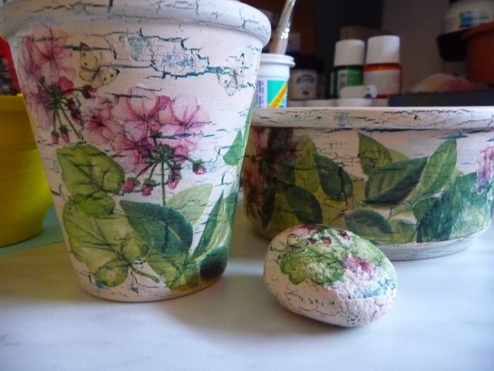 Několik květináčů zdobených technikou decoupage...