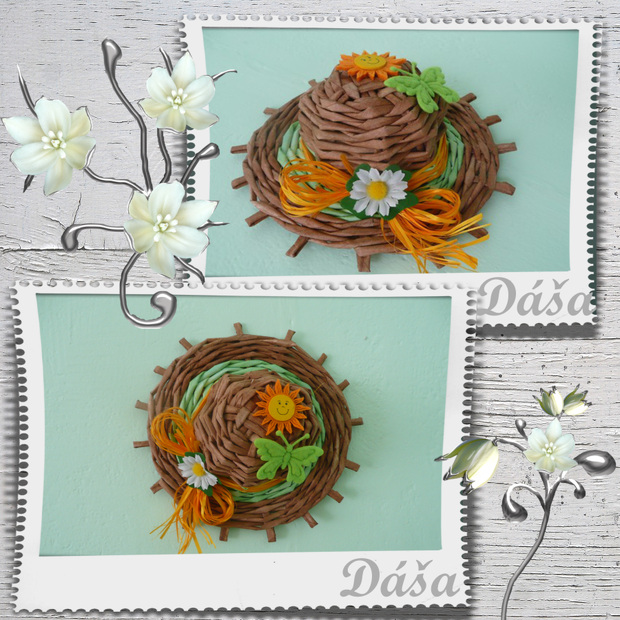 klobouk je vyroben z papírových ruliček, nabarven potravinovými barvivy a nebo mořidly, nalakován penetrací s leskem... klobouk je velice pevný...
