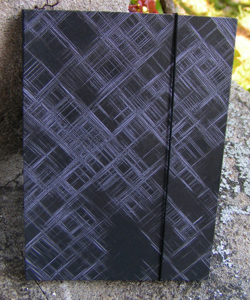 velikost A6, 60 bílých nelinkovaných listů, přední strana potažena vzorovaným papírem, zadní strana černá, přepásáno gumičkou
