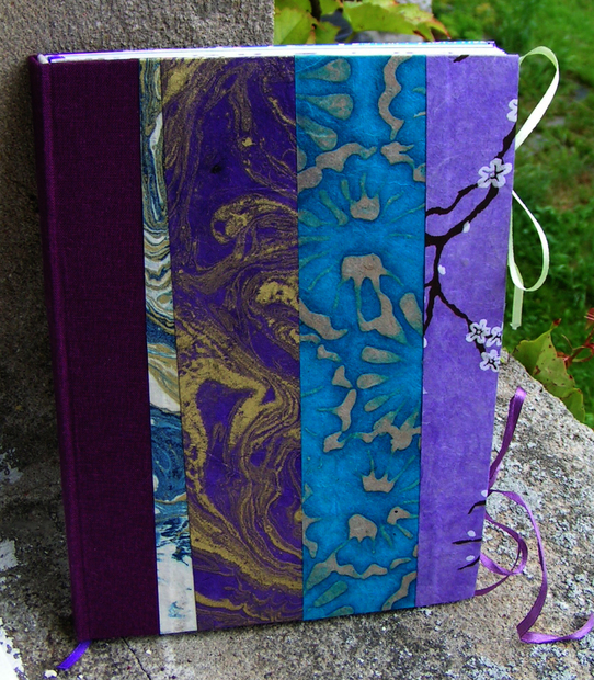 velikost A5, cca 60 listů různě barevných a potištěných, hřbet vázaný v plátně, desky potažené ručním pruhovaným papírem, jedna stužka jako záložka, 4 různě barevné stužky na svázání desek