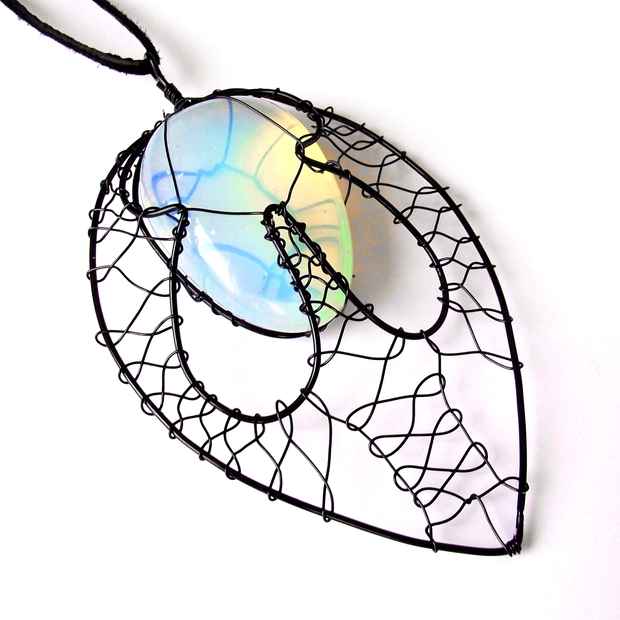 opalit + černý drátek + černá kůže - přívěsek, náhrdelník - 6,5x4,5 cm