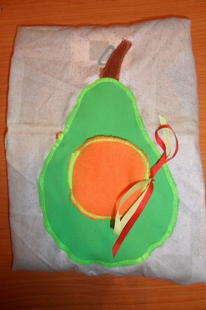 Didaktická pomůcka pro rozvoj jemné motoriky a naučení vázání mašle. Červík je ukryt uvnitř hrušky. Vše je šito z různých materiálů a polštářek je vycpaný vatelínem.