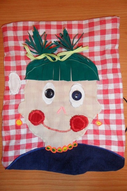 Didaktická pomůcka pro rozvoj jemné motoriky a obratnosti. Holčička má očka na knoflíky, tváře na suchý zip a z vlásků lze udělat culíky. Vše je šito z různých materiálů a polštářek je vycpaný vatelínem.Nevhodné pro děti do 3 let - nemá atest.