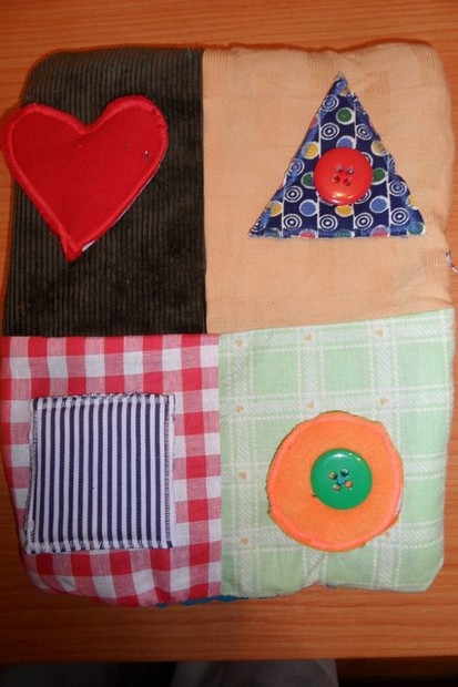 Didaktická pomůcka pro rozvoj jemné motoriky. Dva tvary jsou na knoflíky a dva na suchý zip. Vše je šito z různých materiálů a polštářek je vycpaný vatelínem.Nevhodné pro děti do 3 let - nemá atest.