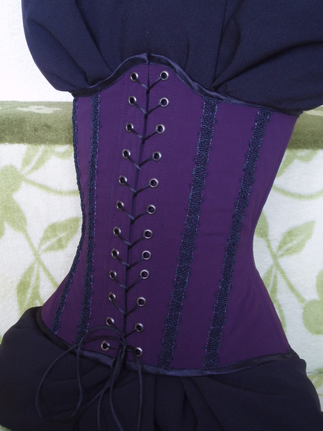 Tmavě fialový underbust korzet s předním šněrováním. Zdobený černou portou a květinovou krajkovou aplikací na zádech