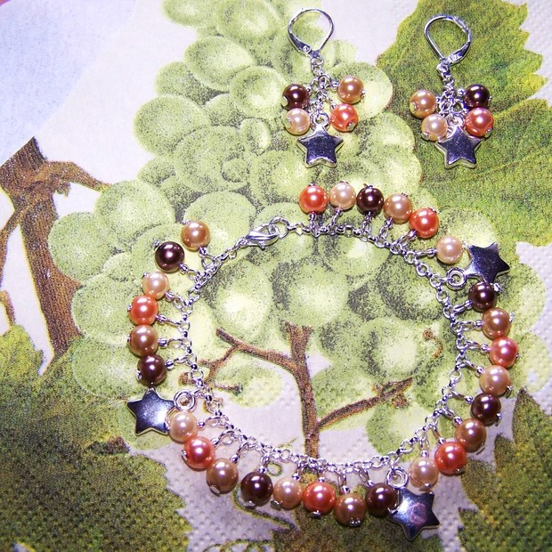 Náramek a náušnice z veskovaných perel a postříbřených komponentů v tónech hnědé, oranžové a pískové barvy.