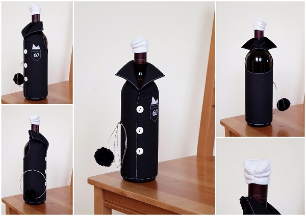 Byla jsem požádána, zda bych nenafotila šedesátiny a abych nešla s prázdnou ušila jsem oblek na láhev, který znázorňuje oslavencovo celoživotní povolání ;)