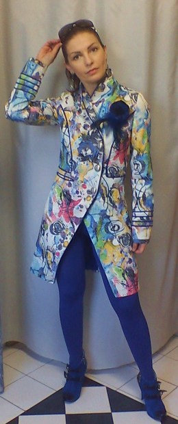 Podšívaný žakardový kabát olemovaný saténovou paspulou s dotvorenou aplikáciou s pierkami
