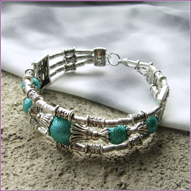 Elegantní náramek PHILON je náramek vyrobený z tyrkysových vroubkovaných voskovaných perel, kombinovaných s komponenty z tibetského stříbra, navlečených na paměťovém drátu. Náramek je na americké zapínání.