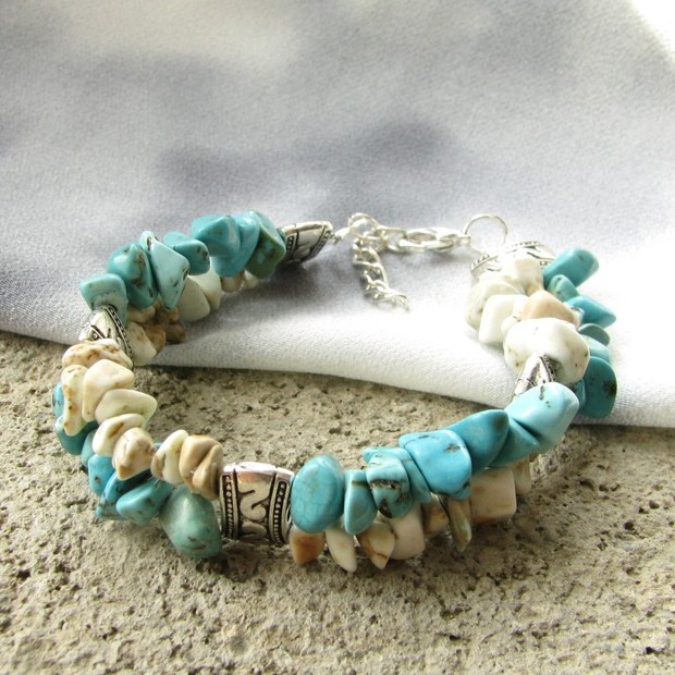 Elegantní náramek MAXIMOS je náramek vyrobený z komponent z tibetského stříbra, kombinovaných s tyrkysovými a krémovými skleněnými zlomky. Náramek má zapínání na karabinku s prodlužovacím řetízkem.