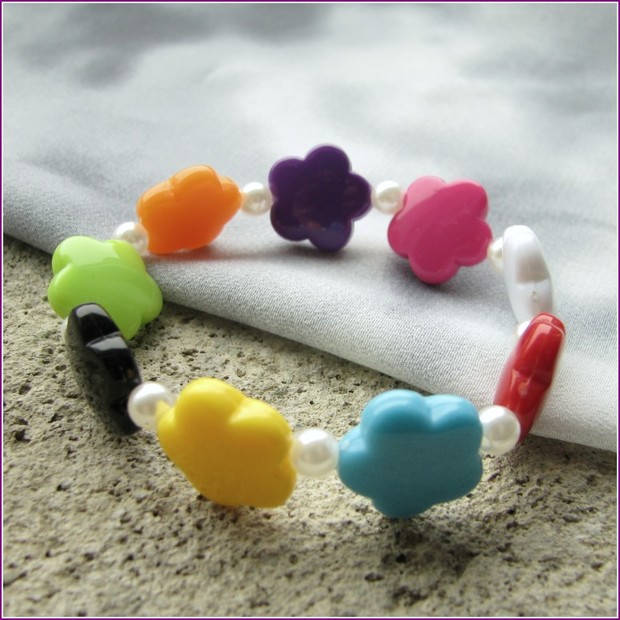 Veselý dětský náramek. Náramek je vyroben z plastových kytiček různých barev, v kombinaci s drobnými voskovanými perličkami, navlečených na gumičce.