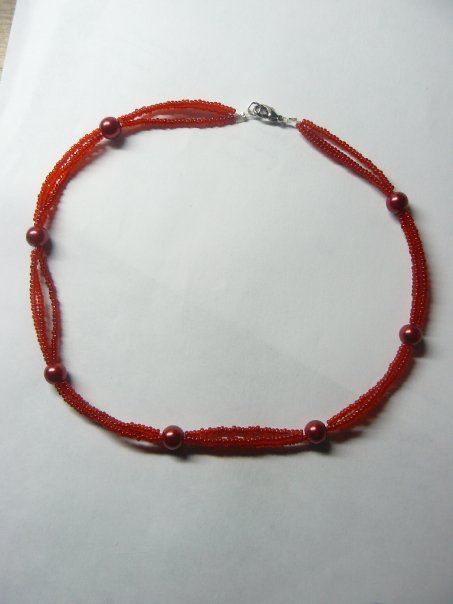 náhrdelník jen tak na zkoušku, úplně obyčejný a jednoduchý z červeného rokajlu a červených voskových perliček, navlečených na vlasci a zakončen karabinkovým zapínáním