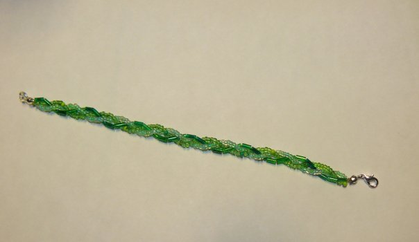 náramek pro strejdovo přítelku ze zelného různě odstínovaného rokajlu a zelených trubiček zapletený do copánku a zakončený karabinkou